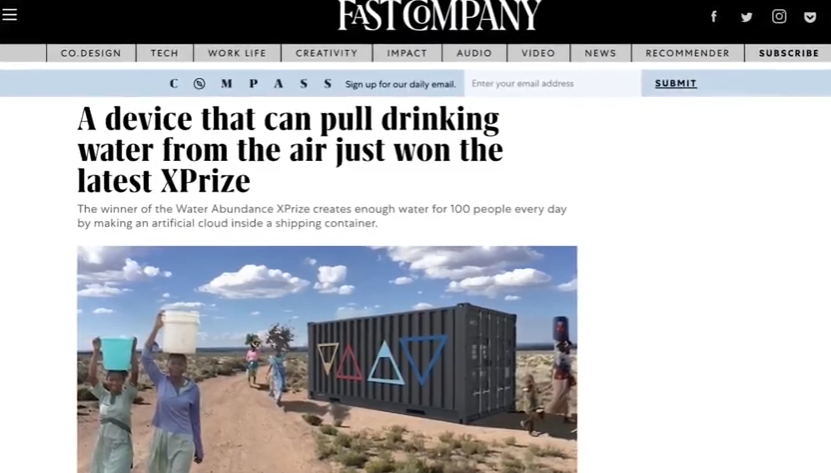 XPRIZE announced the results of The Water Abundance XPRIZE powered by Australian Aid and Tata Group during Visioneering 2018. Skysource is honored to have received this magnificent award, $1.5M Water Abundance XPRIZE. It’s been over two years of hard work, competing against 97 teams from 27 countries to collect a minimum of 2,000 liters of water per day from the atmosphere using 100 percent renewable energy, at the cost of no more than 2 cents per liter. Read more about the journey on XPRIZE’s website.